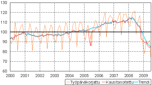 teollisuustuotannon volyymi-indeksi 2000 - 2009 heinäkuu, 2005=100,