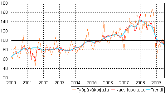 teollisuustuotannon volyymi-indeksi 2000 - 2009 heinäkuu, 2005=100,