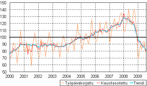 teollisuustuotannon volyymi-indeksi 2000 - 2009 elokuu, 2005=100,