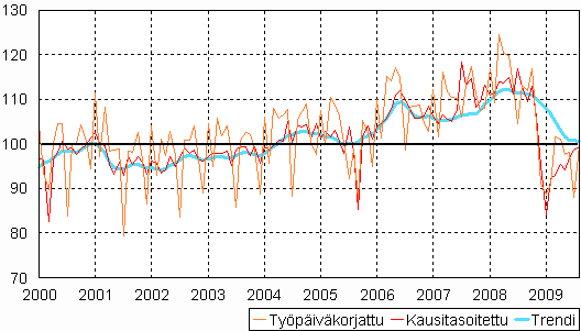 teollisuustuotannon volyymi-indeksi 2000 - 2009 elokuu, 2005=100,