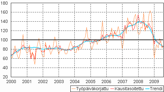 teollisuustuotannon volyymi-indeksi 2000 - 2009 elokuu, 2005=100,