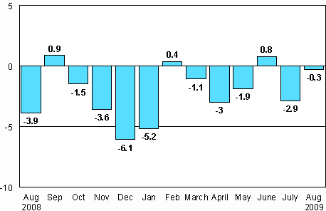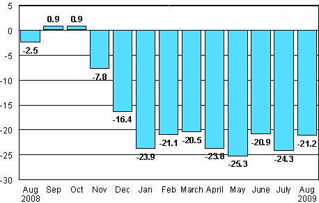 According to Statistics Finland, the working-day adjusted output of total industries (BCDE) was 21.2 per cent lower in August 2009 than twelve months earlier. In July, industrial output fell by 24.3 per cent year-on-year. Over the January to August period, industrial output (BCDE) has decreased by 22.9 per cent from the corresponding period of the year before. During the same time period, output in manufacturing (C) has fallen by 26 per cent and the index point figure for January-August stood at 84.8 (2005=100).