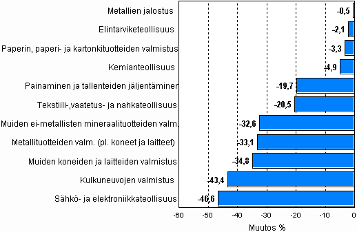 Teollisuustuotannon työpäiväkorjattu muutosprosentti syyskuu 2008 / syyskuu 2009, TOL 2008