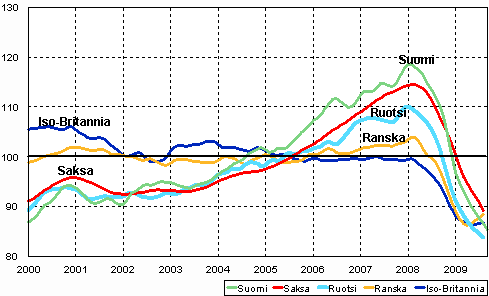 Teollisuustuotannon trendi Suomi (BCDE), Saksa, Ruotsi, Ranska ja Iso-Britannia (BCD) 2000 - 2009, 2005=100, TOL 2008
