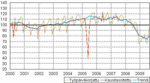 teollisuustuotannon volyymi-indeksi 2000 - 2009 syyskuu, 2005=100,