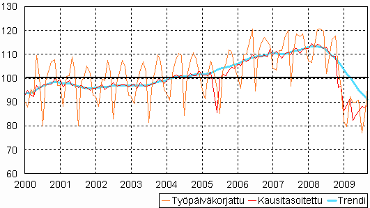 teollisuustuotannon volyymi-indeksi 2000 - 2009 syyskuu, 2005=100,