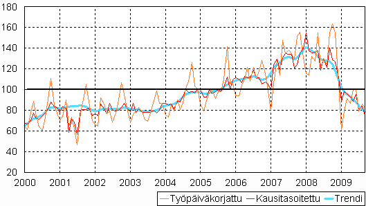 teollisuustuotannon volyymi-indeksi 2000 - 2009 syyskuu, 2005=100,