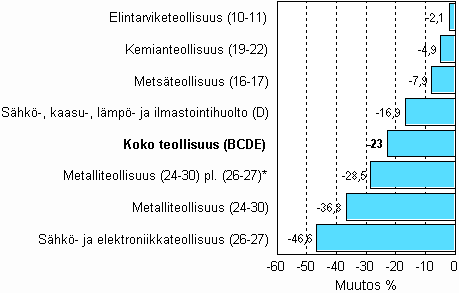 Kaikkien päätoimialojen tuotanto laski syyskuussa vuodentakaisesta. Eniten laski sähkö- ja elektroniikkateollisuuden tuotanto vajaat 47 prosenttia. Metalliteollisuuden tuotanto putosi syyskuussa lähes 37 prosenttia. Metsäteollisuuden tuotanto laski syyskuussa vain 7,9 prosenttia. Viimeksi metsäteollisuuden tuotanto on laskenut vähemmän keväällä 2008. Kemianteollisuuden tuotanto laski syyskuussa vajaat 5 prosenttia.