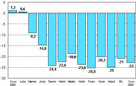 Koko teollisuuden (BCDE) työpäiväkorjattu tuotanto oli Tilastokeskuksen mukaan vuoden 2009 syyskuussa 23 prosenttia pienempi kuin vuotta aikaisemmin. Elokuussa teollisuustuotanto väheni 21 prosenttia vuoden takaisesta. Tammi-syyskuussa teollisuustuotanto (BCDE) on vähentynyt 22,9 prosenttia viime vuoden vastaavasta ajankohdasta. Teollisuuden (C ) tuotanto on vastaavana ajankohta pudonnut 25,6 prosenttia ja tammi-syyskuun indeksipisteluku oli 86,0 (2005=100).