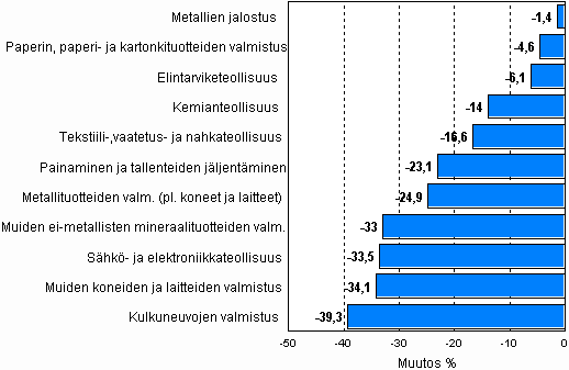 Teollisuustuotannon työpäiväkorjattu muutosprosentti lokakuu 2008 / lokakuu 2009, TOL 2008