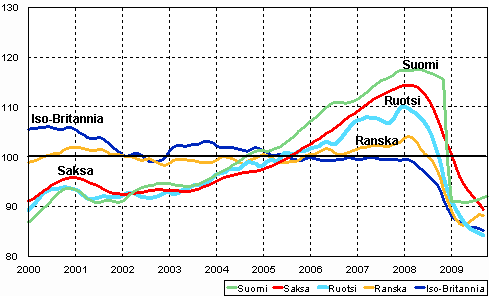 Teollisuustuotannon trendi Suomi (BCDE), Saksa, Ruotsi, Ranska ja Iso-Britannia (BCD) 2000 - 2009, 2005=100, TOL 2008