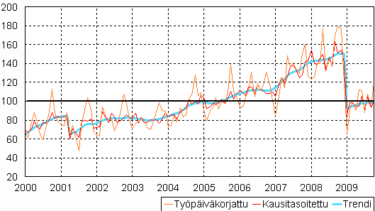 teollisuustuotannon volyymi-indeksi 2000 - 2009 lokakuu, 2005=100,