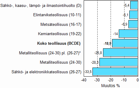Kaikkien päätoimialojen tuotanto laski lokakuussa vuodentakaisesta. Eniten laski sähkö- ja elektroniikkateollisuuden tuotanto, runsaat 33 prosenttia. Metalliteollisuuden tuotanto putosi lokakuussa runsaat 28 prosenttia. Kemianteollisuuden tuotanto laski lokakuussa 14 prosenttia. Metsäteollisuuden tuotanto laski lokakuussa 6,9 prosenttia.