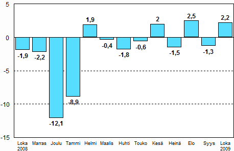 - Teollisuustuotannon kausitasoitettu muutosprosentti syyskuu 2009 / lokakuu 2009, TOL 2008 (10.12.2009)