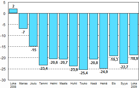 Koko teollisuuden työpäiväkorjattu tuotanto oli Tilastokeskuksen mukaan vuoden 2009 lokakuussa 18,9 prosenttia pienempi kuin vuotta aikaisemmin. Syyskuussa teollisuustuotanto väheni 22,7 prosenttia vuoden takaisesta. Tammi-lokakuussa teollisuustuotanto on vähentynyt 22,4 prosenttia viime vuoden vastaavasta ajankohdasta. Suomen teollisuustuotannon historiallisen syvä pudotus on jatkunut lähes vuoden. Teollisuustuotannon romahdus alkoi viime vuoden joulukuussa.