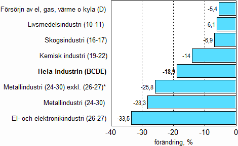 I oktober sjönk produktionen inom alla huvudnäringsgrenar jämfört med året innan. Produktionen inom el- och elektronikindustrin sjönk mest, med drygt 33 procent. Produktionen inom metallindustrin sjönk i oktober med drygt 28 procent. Produktionen inom den kemiska industrin minskade i oktober med 14 procent. Produktionen inom skogsindustrin minskade i oktober med 6,9 procent.
