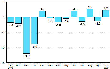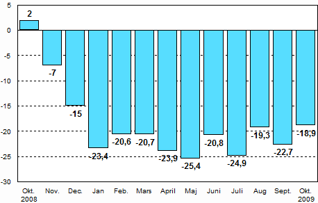 Enligt Statistikcentralen var den arbetsdagskorrigerade produktionen för hela industrin 18,9 procent mindre i oktober 2009 än året innan. I september minskade industriproduktionen med 22,7 procent från året innan. Under januari-oktober har industriproduktionen minskat med 22,4 procent jämfört med motsvarande period året innan. Den historiskt djupa nedgången i Finlands industriproduktion har pågått nästan ett år. Industriproduktionen började rasa i december i fjol.