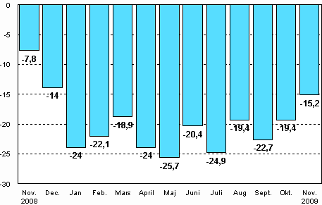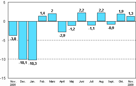 Enligt Statistikcentralen var den arbetsdagskorrigerade produktionen för hela industrin 15,2 procent mindre i november 2009 än året innan. I oktober minskade industriproduktionen med 19,4 procent från året innan. Under januari-november har industriproduktionen minskat med 21,7 procent jämfört med motsvarande period år 2008. Industriproduktionens botten är troligtvis nådd och den säsongrensade produktionen har ökat i oktober och november.