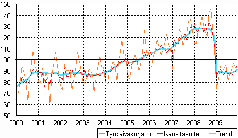 teollisuustuotannon volyymi-indeksi 2000 - 2009 joulukuu, 2005=100,