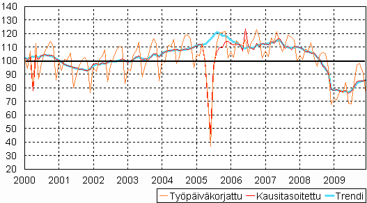 teollisuustuotannon volyymi-indeksi 2000 - 2009 joulukuu, 2005=100,