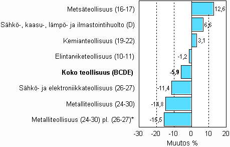 Vuoden takaiseen verrattuna tuotanto laski edelleen useilla päätoimialoilla. Eniten laski tuotanto muussa metalliteollisuudessa, 15,5 prosenttia. Sähkö- ja elektroniikkateollisuuden tuotanto laski 11,4 prosenttia. Elintarviketeollisuudessa tuotanto oli reilun prosentin pienempää kuin vuotta aiemmin. Eniten kasvoi Metsäteollisuus, 12,6 prosenttia. Metsäteollisuuden tuotanto kasvoi vuoden takaiseen verrattuna ensimmäisen kerran yli kahteen vuoteen. Myös sähkön ja lämmön sekä kemianteollisuuden tuotanto kasvoi vuoden takaisesta.