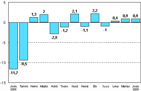 Koko teollisuuden työpäiväkorjattu tuotanto oli Tilastokeskuksen mukaan vuoden 2009 joulukuussa 5,9 prosenttia pienempi kuin vuotta aikaisemmin. Kausitasoitettu tuotanto oli kuitenkin 0,9 prosenttia suurempi kuin marraskuussa. Tuotanto on nyt kasvanut kolmena peräkkäisenä kuukautena edelliseen kuukauteen verrattuna. Viime vuonna teollisuustuotanto oli 20,9 prosenttia alhaisempi kuin vuonna 2008 ja tuotanto oli vuoden 2000 tasolla. Pudotus oli pahin Suomen itsenäisyyden aikana.