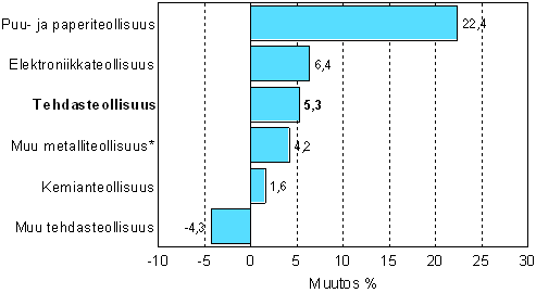Teollisuuden varastot kasvoivat myös edelliseen neljännekseen verrattuna. Tehdasteollisuuden varastot olivat vuoden 2005 syyskuun lopulla 5,3 prosenttia suuremmat verrattuna kesäkuun lopun tilanteeseen. Metsäteollisuuden työtaistelun päättyminen näkyi varastojen kasvuna. Puu- ja paperiteollisuuden varastojen arvo kasvoi runsaat 22 prosenttia kesäkuun loppuun verrattuna.