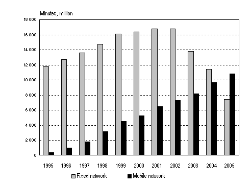 Phone calls: Numbers of outgoing call minutes from the local telephone network and from mobile phones in 1995-2005
