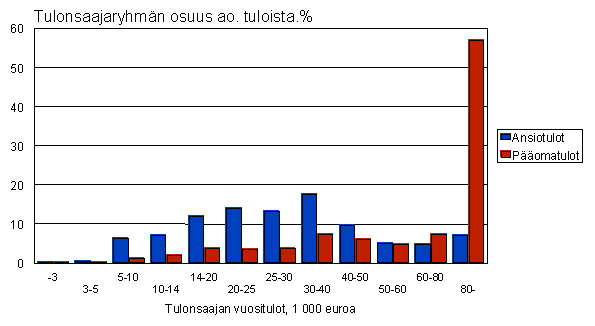 Pääomatulojen osuus tuloista suurin eniten ansaitsevilla