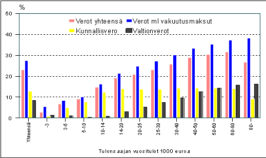 Suhteellisesti eniten veroja ja maksuja maksoivat 60 000 - 80 000 euroa vuodessa ansainneet, joiden veroaste oli 31,7 prosenttia. Yli 80 000 euroa ansainneet maksoivat veroja vähemmän, 26,8 prosenttia tuloistaan. Tämä johtuu siitä, että hyvätuloisimmat saivat 44 prosenttia veronalaisista tuloistaan pääomatuloina, joiden verotus on kevyempää kuin suurehkojen ansiotulojen. Vähintään 80 000 euron vuositulot oli 65 200 henkilöllä vuonna 2004 eli puolellatoista prosentilla tulonsaajista.
