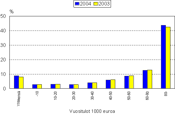 Kuvio 3. Pääomatulojen osuus veronalaisista tuloista tuloluokittain 2004 ja 2003