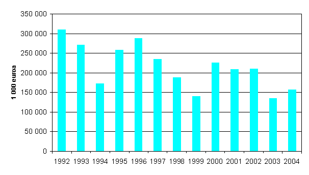 Kuvio 1. Teollisuuden ympäristönsuojeluinvestoinnit 1992-2004