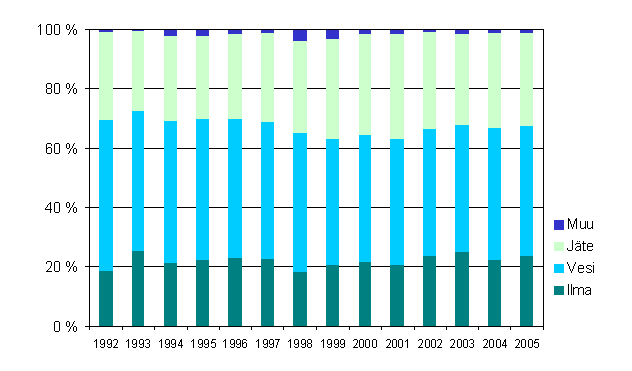 Kuvio 5. Ympäristönsuojelun käyttö- ja kunnossapitomenojen kohdentuminen 1992-2005