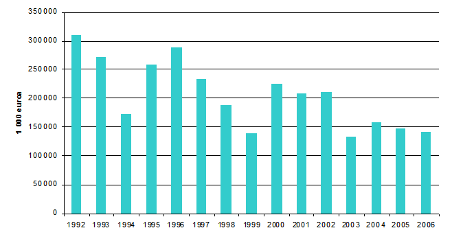 Kuvio 1. Teollisuuden ympäristönsuojeluinvestoinnit 1992-2006