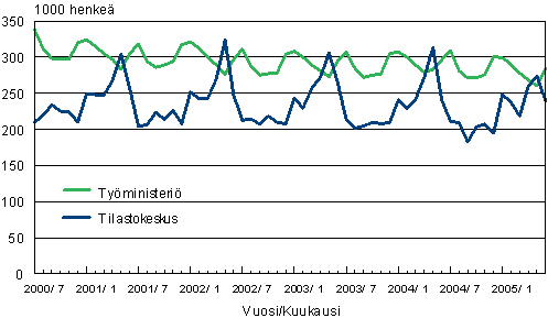Työttömät Tilastokeskuksen työvoimatutkimuksen ja työministeriön työnvälitystilaston mukaan