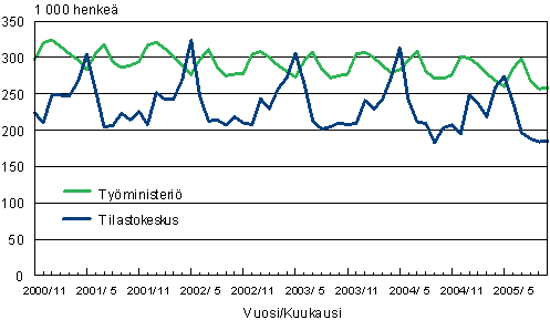 Työttömät Tilastokeskuksen työvoimatutkimuksen ja työministeriön työnvälitystilaston mukaan