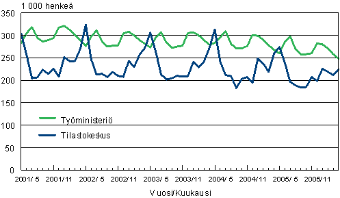 Työttömät Tilastokeskuksen työvoimatutkimuksen ja työministeriön työnvälitystilaston mukaan