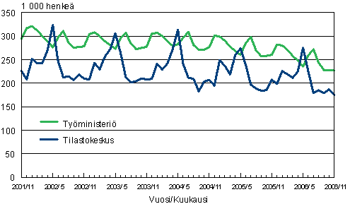 Työttömät Tilastokeskuksen työvoimatutkimuksen ja työministeriön työnvälitystilaston mukaan