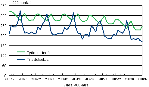 Työttömät Tilastokeskuksen työvoimatutkimuksen ja työministeriön työnvälitystilaston mukaan