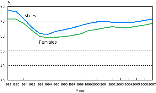 Employment rates by sex in 1989-2007, 15-64 year olds