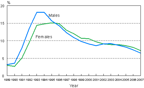 Unemployment rates by sex in 1989-2007, 15-74 year olds