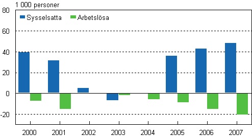 Förändring i antalet sysselsatta och arbetslösa från året innan 2000 - 2007