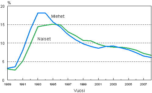Työttömyysasteet sukupuolen mukaan vuosina 1989-2008, 15-74-vuotiaat