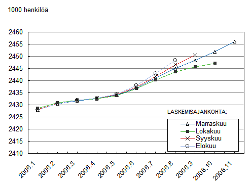 Kuvio 2. havainnollistaa, miten tuoreimman tiedon lisääminen muuttaa trendin viimeisimpiä lukuja. Kuvioon on piirretty neljä eri kuukausina laskettua trendiä, jotka kuvaavat työllisten lukumäärän kehitystä vuonna 2006. Kuviosta näkyy, kuinka myöhemmin laskettu trendi poikkeaa aiempien trendien viimeisistä luvuista. Trendiluvuista päätelmiä tehtäessä on tämä viimeisimpien lukujen ennakollinen luonne syytä ottaa huomioon.