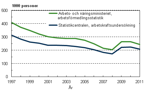 Statistikcentralens och arbets- och näringsministeriets arbetslösa åren 1997–2011