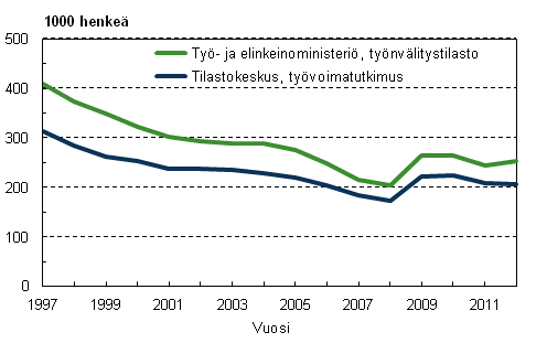 Tilastokeskuksen ja työ- ja elinkeinoministeriön työttömät vuosina 1997–2012