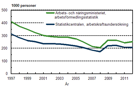 Statistikcentralens och arbets- och näringsministeriets arbetslösa åren 1997–2012
