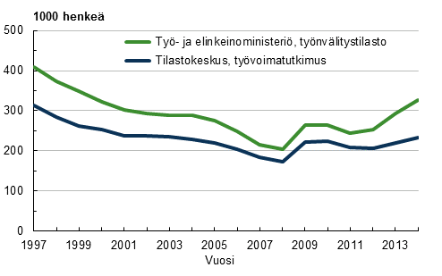 Tilastokeskuksen työttömyysluvut perustuvat otospohjaiseen työvoimatutkimukseen. Työ- ja elinkeinoministeriön luvut perustuvat puolestaan TE-toimistojen asiakasrekisterin pohjalta laadittuun Työnvälitystilastoon. Tilastokeskuksen ja työ- ja elinkeinoministeriön luvut ovat aina poikenneet toisistaan. Vuosina 2006-2011 työttömiä oli työvoimatutkimuksen mukaan vuositasolla 31 000-44 000 henkilöä vähemmän kuin Työnvälitystilaston mukaan. Vuodesta 2012 alkaen työttömien lukumäärän ero on kasvanut, ollen 94 000 vuonna 2014 (kuvio). Merkittävin syy työttömyyslukujen eroon on tilastojen erilainen työttömän määrittely. Eroa ovat lisäksi kasvattaneet sekä työttömyyseläkkeestä luopuminen että Työnvälitystilaston työttömän työnhakijan määrittelyyn vaikuttavat lainsäädännön muutokset.