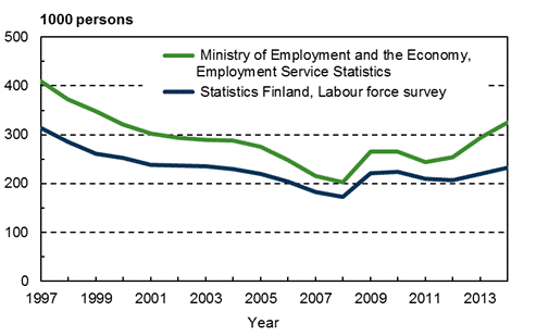 Unemployed persons in the statistics of Statistics Finland and the Ministry of Employment and the Economy in 1997 to 2014, annual averages