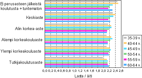 Biologisten lasten määrä ikäryhmittäin lapsia saanutta naista kohden eri koulutustasoilla 2004